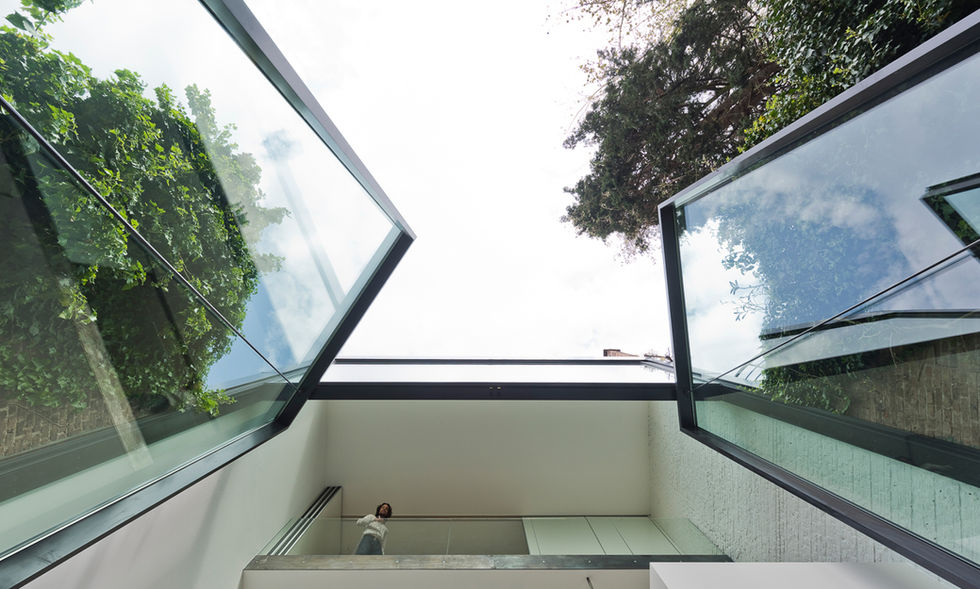 Oneigenlijke aanbouwen ruimden plaats voor een geheel van ruimte en licht. Een strakke, hedendaagse en tijdloze achtergevel, met gigantische pivoterende ramen (3 m breed, 6 m hoog), kwam in de plaats. Het raam is een knipoog naar de klassieke T-verdeling van ramen – zij het ietwat groter – en zorgt voor een sterk binnen/buitengevoel tussen de triplex en de tuin. Op die manier ontstaan nieuwe ruimtelijke relaties en visuele verbindingen: oud-nieuw, boven-beneden, interieur-exterieur.