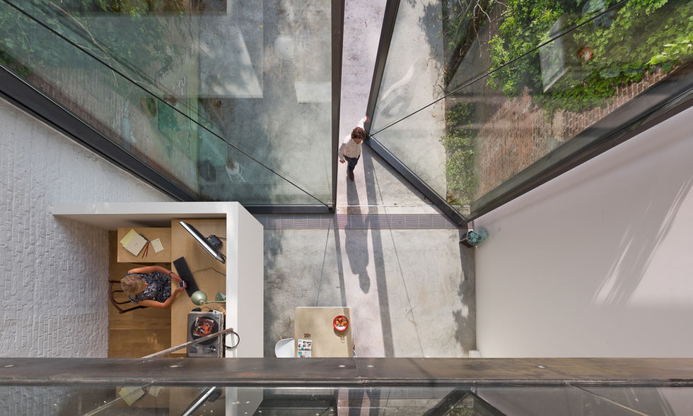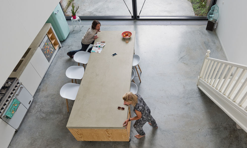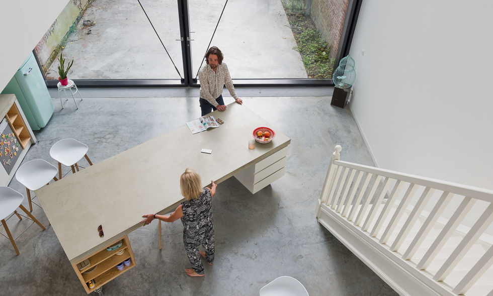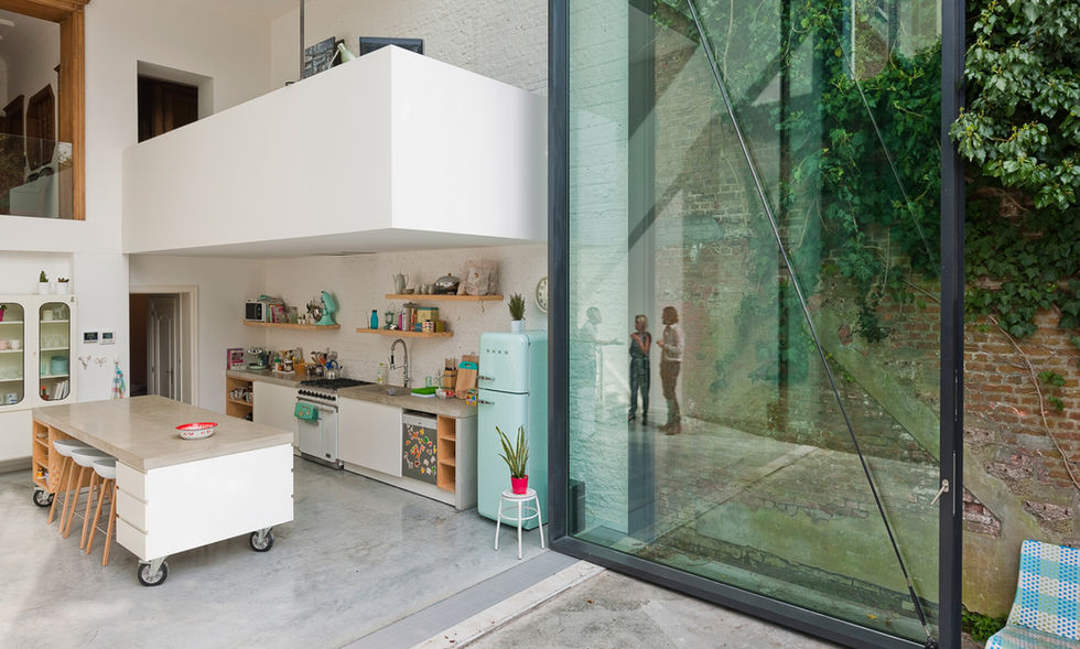 De voorgevel blijft plechtig zijn geschiedenis en welvoeglijke burgerzin vertolken, netjes in de rij. Doordat de woning georganiseerd was als een bel-etagewoning, had de leefruimte geen enkel contact met de tuin. Een leefkeuken in relatie met de tuin, een grote masterbedroom met dressing, kinderkamers met eigen sanitair en een bureau: daar droomden de jonge bouwheren van.